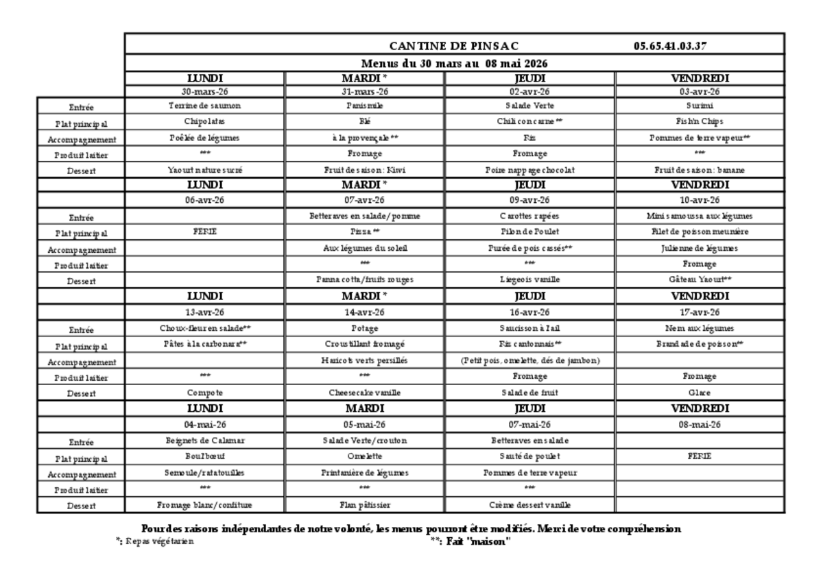 Menu cantine du 30 mars au 8 mai 2026
