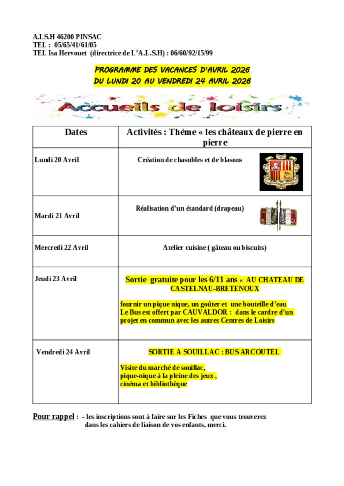Programme des vacances d'avril du 20 au 24 avril 2026